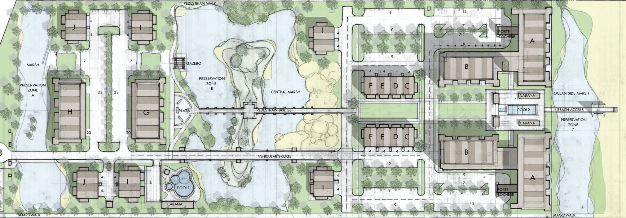 St. Augustine Oceanfront Development is a master planning project prepared for the City of St. Augustine for a 1.8 acres site. The design consists a vacation residences of 3 building types: condo flats, condo townhomes, and condo duplexes with public amenities such pools and cabanas along with a pedestrian connector systems, sidewalks and a boardwalk. The project’s concept utilizes New Urbanism planning principles and pragmatism.